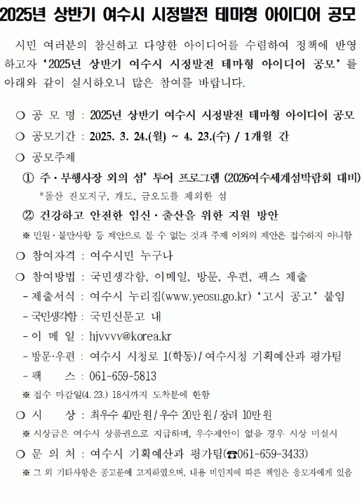 이번 공모는 오는 4월 23일까지 진행되며, 여수시 발전에 관심 있는 시민이라면 누구나 참여할 수 있다.