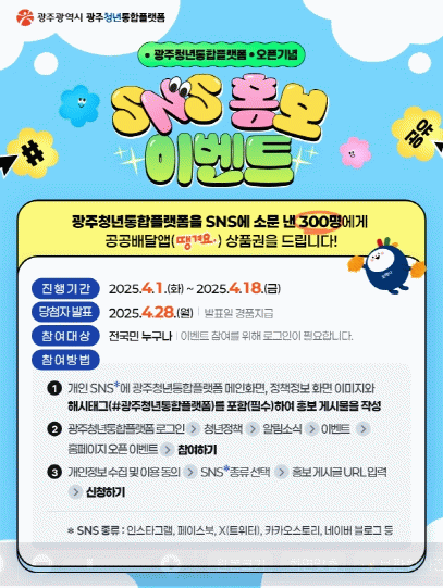 참여 방법은 개인 사회관계망서비스(SNS)에 광주청년통합플랫폼 메인·정책정보 관련 홍보게시물을 이미지, 해시태그(#광주청년통합플랫폼)와 함께 작성, 플랫폼 이벤트 페이지에서 게시글 주소를 입력하면 된다. 자세한 이벤트 참여 방법은 광주청년통합플랫폼과 광주시 누리집을 참조하면 된다.