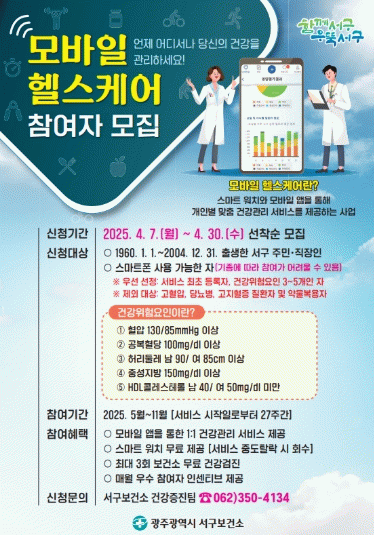 이은주 건강증진과장은 “모바일 헬스케어는 바쁜 일상에서도 쉽고 효과적으로 건강을 관리할 수 있는 프로그램이다”며 “건강한 생활 습관 형성이 필요한 지역 주민들의 많은 관심과 참여를 바란다”고 말했다.
