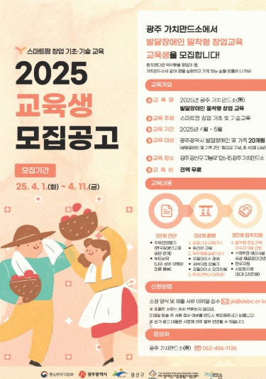 박영숙 장애인복지과장은 “광주 가치만드소는 발달장애인 가족에게 지속 가능한 일자리를 제공하기 위한 창업 지원 사업이다”며 “경제적 자립에 관심 있는 발달장애인 가족의 많은 참여를 바란다”고 말했다.