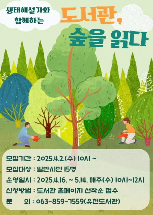 익산시 유천도서관은 '도서관, 숲을 읽다'를 주제로, 시민들이 자연과 생태에 대한 다양한 지식을 배우고 실천할 수 있는 '생태 프로그램'을 운영한다고 1일 밝혔다.