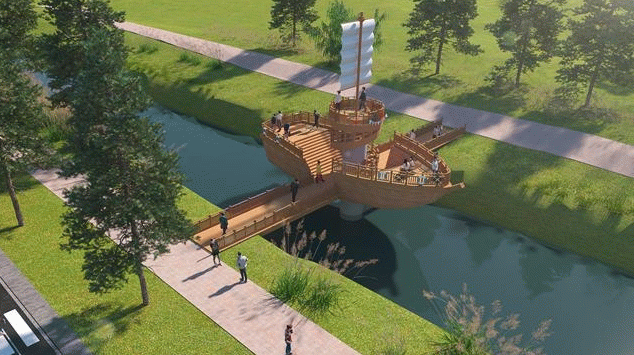 보행교는 신운천이 시작되는 초입부에 조성된 뱃머리 조형물을 모티브로 신운천을 따라 흘러가는 배를 형상화했으며 배 위에 설치된 돛에 조그마한 망루를 계획해 전망탑의 기능을 할 수 있도록 계획했다.