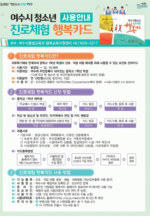 지원 대상은 여수시에 거주하는 중학교 1학년 재학생과 13세 학교 밖 청소년으로, 시는 지난달 25일부터 2,357명에게 행복카드를 교부했다.