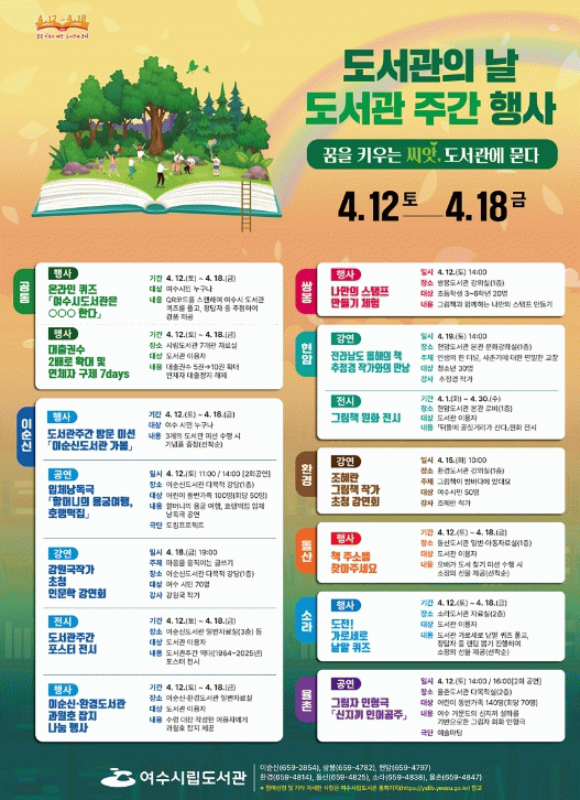 도서관의 날·도서관 주간 행사 세부 내용과 프로그램 참여 방법은 여수시립도서관 누리집 공지사항을 통해 확인할 수 있다.