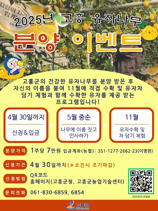 군 관계자는 “유자나무 분양 이벤트에 참여하는 분들에게 고흥의 유자를 체험하는 기회를 제공할 뿐만 아니라, 지역 주민의 농업소득 증대로 이어지는 좋은 계기가 될 것”이라고 말했다.
