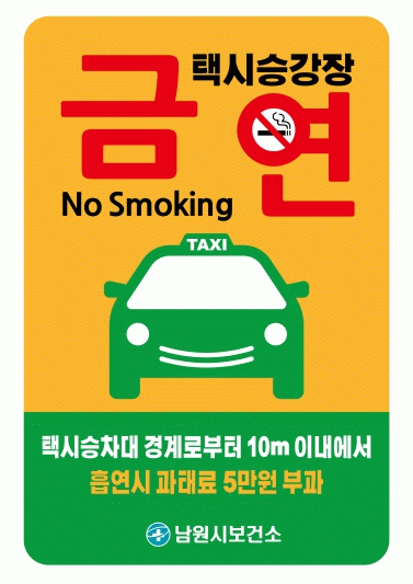 대중교통 이용객의 간접흡연 피해를 줄이기 위해 2021년 버스정류장 주변 10m 이내의 구역을 금연구역으로 지정한 데 이어 올해 모든 택시승차대의 경계로부터 10m 이내의 구역을 금역구역으로 확대‧지정한다. 해당 구역에서 흡연 행위 적발 시 5만 원의 과태료가 부과된다.