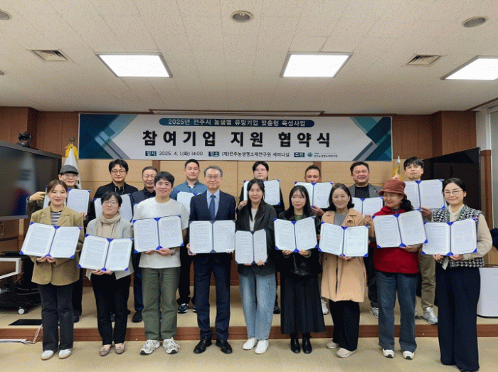 (재)전주농생명소재연구원은 1일 ‘2025년 전주시 농생명 유망기업 맞춤형 육성사업’에 참여하는 성보유한회사 등 16개 기업 대표와 사업 추진을 위한 업무협약을 체결했다.