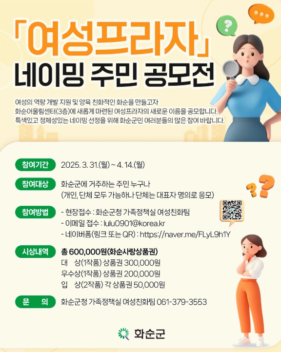 공모 기간은 3월 31일부터 4월 14일까지로 화순군에 거주하는 주민 누구나 신청이 가능하며, 홍보 포스터 내 QR코드로 접속하여 신청하거나 신청서를 작성하여 현장 또는 메일 접수하면 된다.