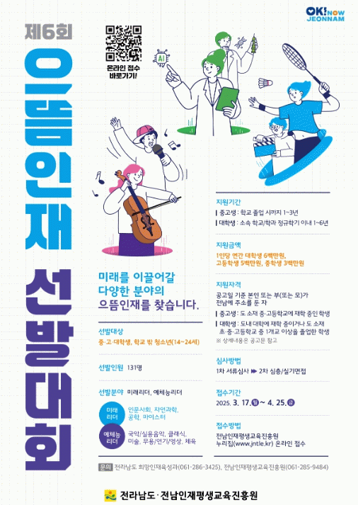 으뜸인재 선발대회는 지역 발전을 이끌 핵심인재 육성을 위한 ‘전라남도 인재육성 고속도로’ 사업 일환으로 2019년부터 시작해 6년 동안 481명을 선발·지원했다.