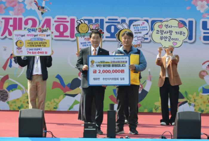 지난 4월 1일 계화면 창북초등학교에서 열린 계화면민의 날 행사에서 계화면 새마을지도자협의회(협의회장 전용호)와 계화면 주민자치위원회(위원장 박병무)가 부안군 고향사랑기부제에 동참하며 각각 1백만원과 2백만원을 기탁했다.