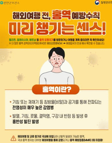 라영현 보건행정과장은 “홍역은 예방접종으로 충분히 막을 수 있는 질병”이라며 “해외여행 전후 홍역 및 해외감염병을 예방할 수 있도록 예방접종 등 감염병 예방수칙을 철저히 준수해 줄 것”을 적극 당부했다.