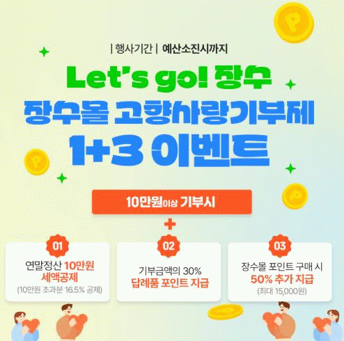 이번 행사는 2025년 연초 기부자를 포함해 선착순 200명을 대상으로 하며 장수몰 포인트를 최대 1만 5천원까지 추가 적립해 주는 이벤트다.
