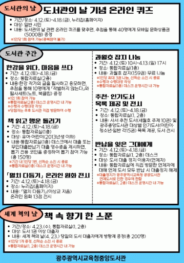 광주중앙도서관은 오는 12일부터 23일까지 시민을 대상으로 ‘도서관의 날·도서관 주간 및 세계 책의 날’ 행사를 진행한다.