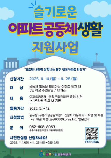 아파트 입주민 5인 이상이 모인 공동체라면 신청이 가능하며, 접수 기간은 14일부터 28일까지다. 이메일 및 현장 접수를 받으며 자세한 내용은 동구청 및 푸른마을공동체센터 누리집을 통해 확인하면 된다.