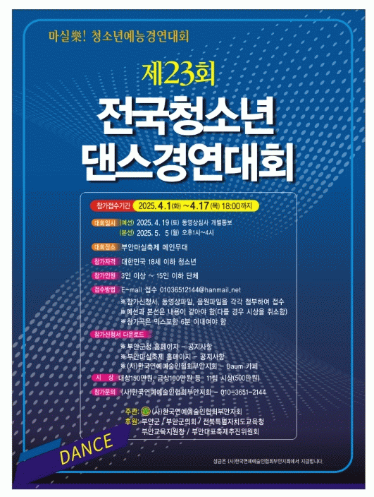 이번 대회는 지역 청소년들에게 다양한 문화·예술 경험을 제공하고 창의적인 인재를 발굴하기 위해 군이 주최하고 (사)한국연예예술인협회 부안지회가 주관해 추진되며 오는 5월 5일 오후 1시 제12회 부안마실축제 기간에 개최된다.