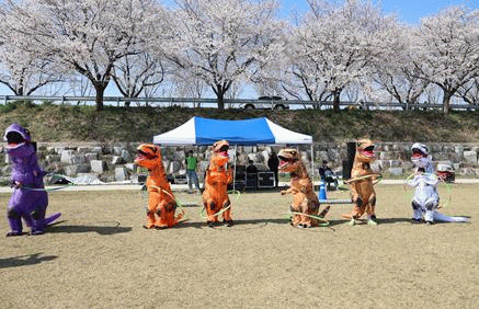 만경강의 만개한 벚꽃과 함께 공룡 복장을 한 참가자들이 펼친 명랑 운동회는 이색적인 풍경을 연출하며 현장에 활기를 더했다.