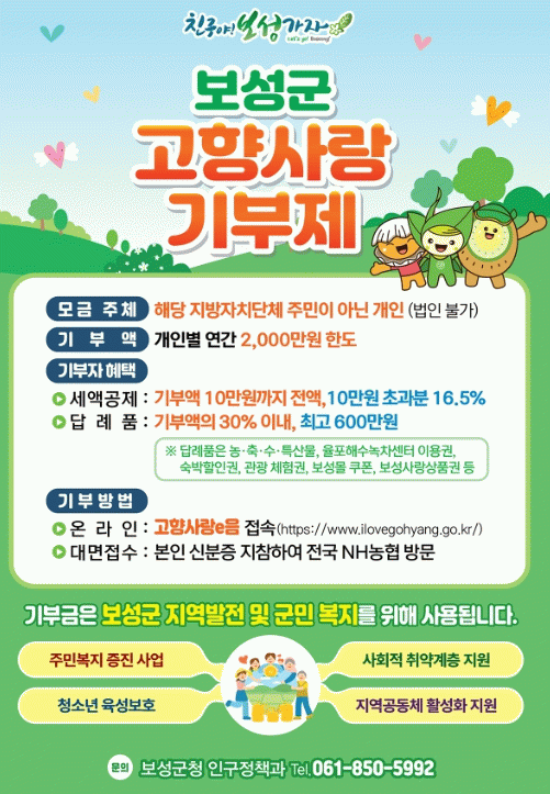한편, 고향사랑기부제는 개인이 관할 주소지를 제외한 지방자치단체에 고향사랑e음과 농협 영업점을 통해 일정 금액을 기부하면 세액공제와 답례품(기부액 기준 최대 30%) 혜택을 받을 수 있다.