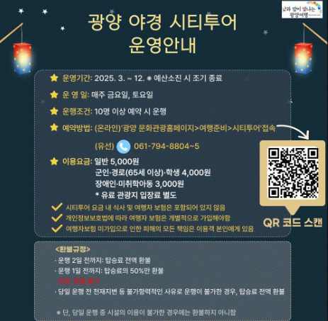 김미란 광양시 관광과장은 “광양시는 에코아트힐링, 야경, 단체투어 등 관광객의 다양한 취향을 존중하는 수요자 중심의 투어를 지향한다”며 “이용자들의 접근성을 높이고 선택권을 확대하기 위해 순천역에서 출발하는 관내코스와 광주유스퀘어에서 출발하는 광역코스로 낮과 밤이 빛나는 광양시티투어를 운영하고 있다”고 말했다. 이어 “문화관광해설사의 깨알 같은 해설과 함께 유익하고 재미있는 광양여행을 선사할 광양시티투어에 많은 관심과 참여를 바란다”고 전했다.