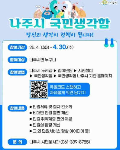 김미령 나주시 시민봉사과장은 “이번 국민생각함 의견 수렴을 통해 시민의 목소리에 귀를 기울이는 소통 행정 강화와 민원 편의 개선에 최선을 다하겠다”며 많은 관심과 참여를 요청했다.
