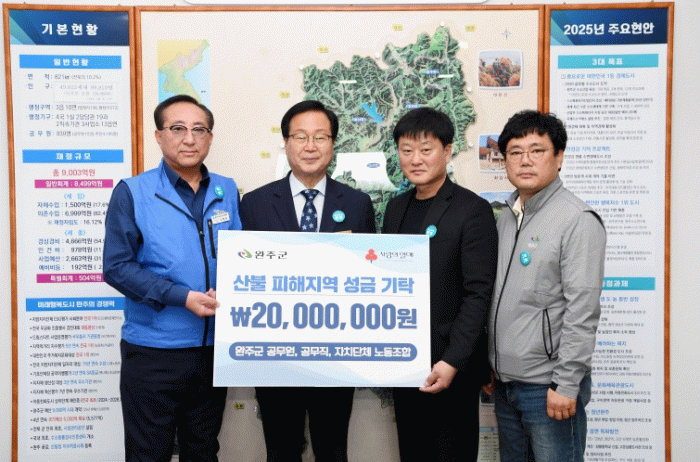 유희태 완주군수는 “갑작스러운 산불로 큰 피해를 본 주민께 깊은 위로를 전한다”며 “10만 완주군민과 공직자가 하나 되어 모은 정성이 이재민들의 빠른 일상회복에 보탬이 되길 바란다”고 말했다.