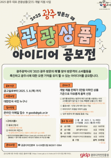 이번 공모전은 ‘2025 광주방문의 해’와 ‘제45주년 5·18민주화운동’, ‘광주디자인비엔날레’, ‘광주 2025 세계(장애인)양궁선수권대회’ 등 다양한 대형행사를 앞두고 광주를 찾는 관광객들에게 매력적인 기념품을 선보이기 위해 마련됐다.
