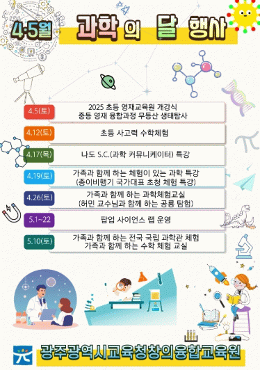행사는 지난 5일 ‘2025 초등영재교육원 개강식’ 및 ‘중등 영재 융합과정 무등산 생태탐사’를 시작으로 ▲4월 12일 초등 사고력 수학체험 ▲17일 나도 S.C.(과학 커뮤니케이터) 특강 ▲19일 가족과 함께 하는 체험이 있는 과학 특강(종이비행기 국가대표 초청 체험 특강) ▲26일 가족과 함께하는 과학체험교실 ▲5월 1~22일 팝업 사이언스 랩 ▲10일 ‘가족과 함께 하는 대전·대구 국립 과학관 체험’ ‘가족과 함께 하는 수학 체험 교실’ 등으로 진행된다.