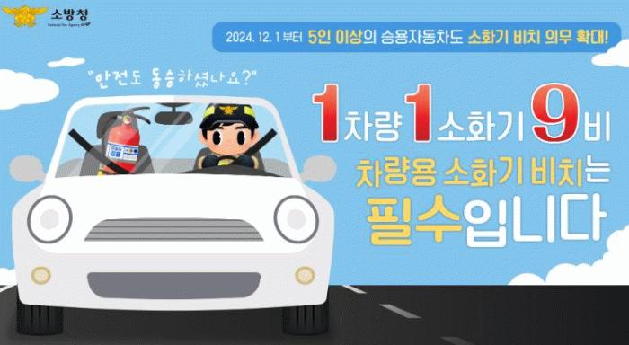 현재 '자동차안전기준에 관한 규칙' 제102조에 따라, 7인승 이상의 승합차, 3.5톤 이상 화물차, 특수차, 어린이 통학차량 등에는 차량용 소화기 비치가 의무화되어 있다.