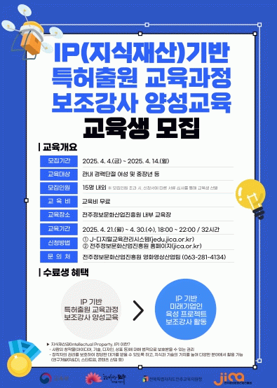‘IP(지식재산)기반 특허출원 교육과정 보조강사 양성교육’은 오는 21일부터 30일까지 전주정보문화산업진흥원 내부 교육장에서 진행되며, 총 32시간(8일 과정)으로 운영된다. 교육은 평일 오후 6시부터 10시까지 진행되며, 15명 내외의 교육생을 모집한다.