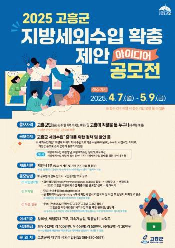 이번 공모전은 고흥군민(출향 향우 및 거주 외국인 포함)과 고흥군에 직장을 둔 누구나 참여할 수 있으며, 군 자주재원 확충을 위한 군민들의 참신한 아이디어를 세외수입 정책에 반영하기 위해 기획됐다.