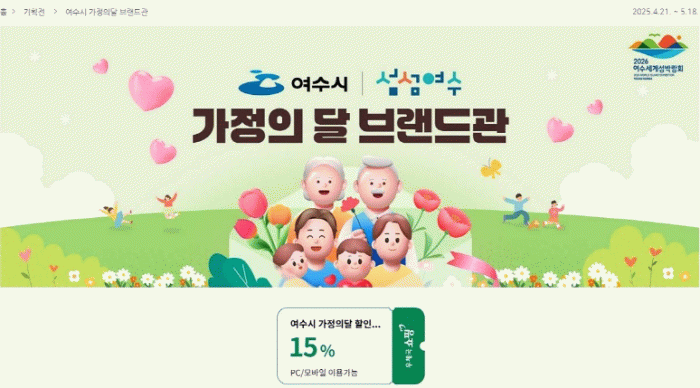 시 관계자는 “이번 가정의달 할인행사를 통해 전국의 소비자들에게 여수의 우수한 농수특산품을 알리고, 소비자 인지도를 제고하는 좋은 기회가 될 것으로 기대한다”고 말했다.