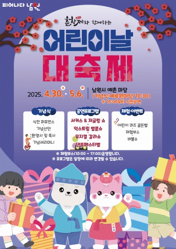 행사는 남원예촌 마당에서 열리며 ▲서커스&저글링 공연 ▲어린이집 재능공연 ▲청소년 어울림 마당 ▲익스트림 벌룬쇼 ▲어린이 뮤지컬 갈라쇼 등의 다양한 공연 콘텐츠가 마련되어 어린이들에게 즐거움을 선사할 예정이다. 이와 함께, 가족 단위 관람객이 참여할 수 있는 놀이체험 부스를 운영하여 축제의 풍성함을 더할 것으로 보인다.