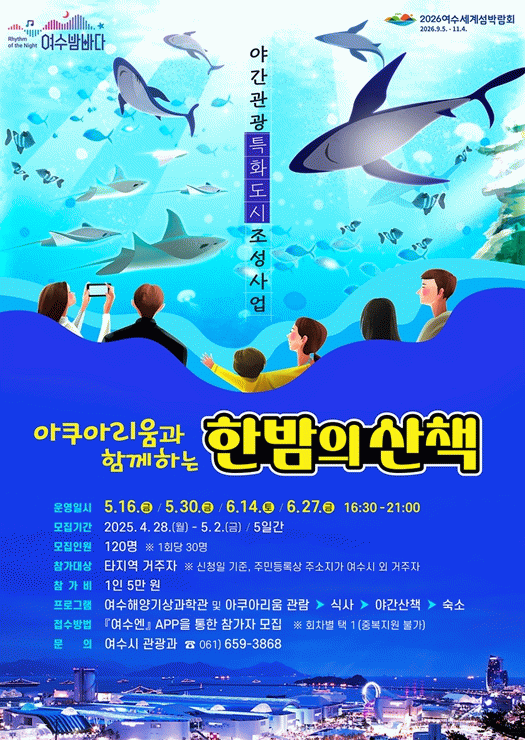시 관계자는 “이번 프로그램은 관내 주요 관광시설과 야간관광을 연계한 체험형 프로그램으로 여수의 새로운 매력을 느낄 수 있는 좋은 기회가 될 것”이라며, “앞으로도 지역 관광 활성화를 위한 다채로운 프로그램을 지속적으로 발굴해 나가겠다”고 밝혔다.