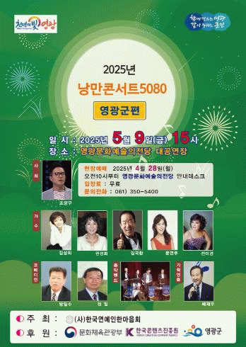 이번 공연은 영광군민의 향수를 자극하고 따뜻한 추억을 선사하기 위해 마련된 뜻깊은 자리로, 중·장년층에게는 낭만과 감동을, 온 가족에게는 즐거움과 공감의 무대를 선보일 예정이다.