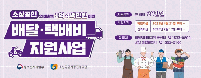 지원 대상은 연 매출 1억 400만 원 미만이고, 24년 1월부터 25년 12월까지 배달·택배비 이용 실적이 있는 소상공인이며, 배달·택배 이용 실적에 따라 최대 30만 원까지 지원받을 수 있다.