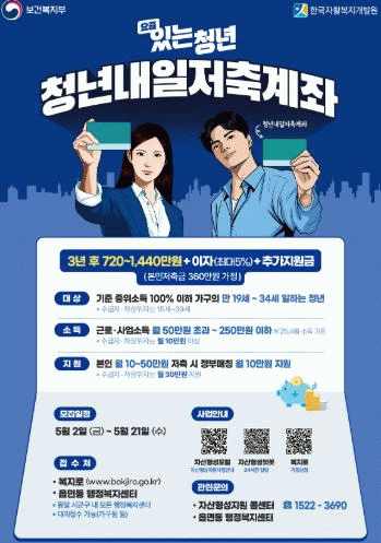 3년 만기 시점에는 본인 저축액 360만 원과 정부지원금 1,080만 원을 합한 1,440만 원과 이자를 받을 수 있다.
