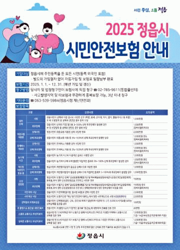 먼저 시민안전보험은 정읍시에 주민등록을 둔 모든 시민이 별도 절차 없이 자동 가입된다.