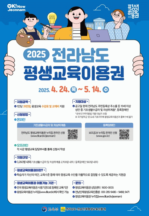 광양시는 올해 총 301명(일반 269명, 장애인 32명)을 선정해 평생교육이용권을 발급할 계획이다.