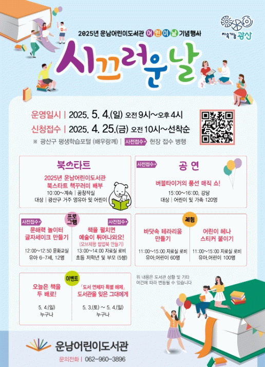 운남어린이도서관 관계자는 “아이들의 창의성과 다양성을 존중하고 어린이들이 언제가 가고 싶어 하는 도서관을 만들고자 행사를 마련했다”며 “시끄러운 날 행사에 많은 참여와 관심 부탁드린다”고 전했다.