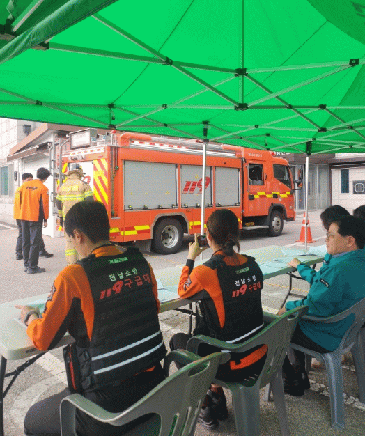 담양군에 따르면 지난 23일 오후 담양군보건소 선별진료소 앞 주차장에서 김동진 보건소장을 비롯한 직원 70여 명, 소방관 6명이 참여한 가운데 보건소 소방합동훈련이 이뤄졌다.