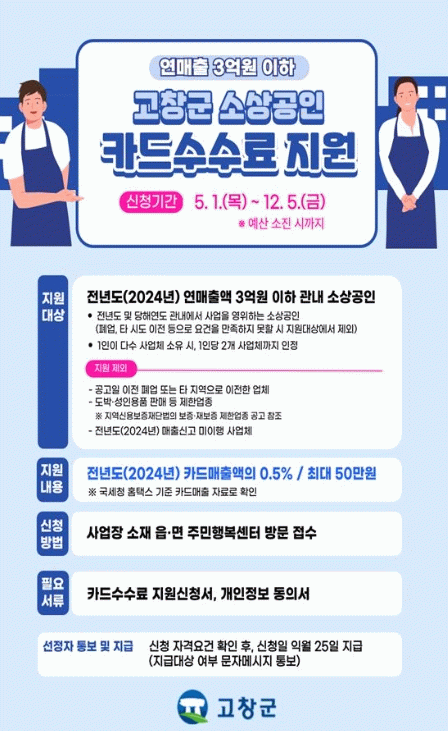 신청을 원하는 소상공인은 사업장 소재지 읍·면 행정복지센터를 방문해 신청할 수 있으며, 자세한 사항은 고창군청 홈페이지에 게시된 공고문을 통해 확인할 수 있다.