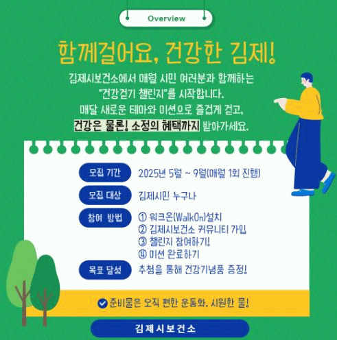 참여 방법은 간단하다. ‘워크온’앱을 설치하고 [김제시 커뮤니티]에 가입 → 챌린지 참여하기 → 월별 목표 걸음수를 실천하면 된다. 챌린지 성공자 중 일부를 추첨하해 걷기 실천 기념품도 제공할 예정이다.