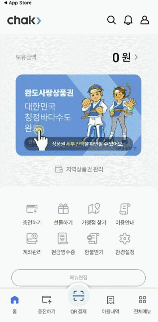 모바일 완도사랑상품권은 구글 플레이나 앱 스토어에서 ‘지역상품권chak’ 어플을 설치한 다음 회원 가입 후 계좌를 연결하여 금액을 충전하면 QR 결제로 바로 사용 가능하다.