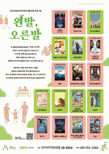 5월 상영 일정은 순천시영상미디어센터 누리집에서 확인할 수 있으며 모든 영화는 무료로 제공된다. 자세한 사항은 전화로 문의하면 된다.