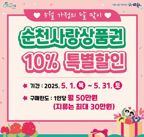 시 관계자는 “순천사랑상품권 특별할인 판매를 통해 모두에게 따뜻한 가정의 달이 되길 바라며, 이번 기회가 지역경제 활성화에도 도움이 되기를 기대한다”고 말했다.