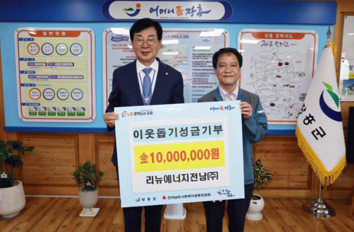 장흥군 관계자는 “지역을 위한 나눔에 앞장서 준 리뉴에너지전남(주)에 깊이 감사드린다”며, “기탁해 주신 성금은 도움이 절실한 이웃들에게 투명하고 소중하게 전달하겠다”고 밝혔다.