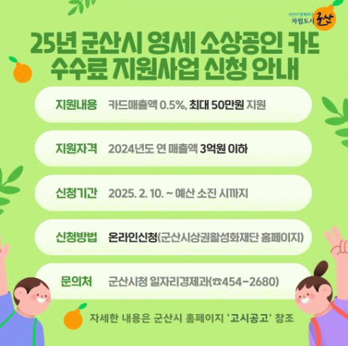 군산시 이헌현 일자리경제과장은 “고물가 고금리 상황에서 카드수수료 지원사업이 소상공인의 경영 안정과 지역경제 활력 도모에 보탬이 되길 바란다.”라며 “소상공인들에게 앞으로도 힘이 될 수 있도록 다양한 정책을 적극적으로 발굴하여 추진하겠다.”라고 밝혔다.