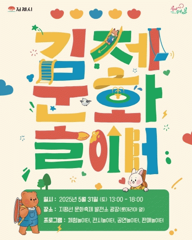 정성주 김제시장은 “이번 김제문화놀이터를 통해 가족 모두가 함께 즐길 수 있는 시간이 되길 바라며, 앞으로도 다양한 맞춤형 문화 프로그램을 제공하여 김제시민이 문화예술을 향유 할 수 있는 기회를 확대하고 일상에 활력을 줄 수 있도록 노력하겠다.”고 밝혔다.
