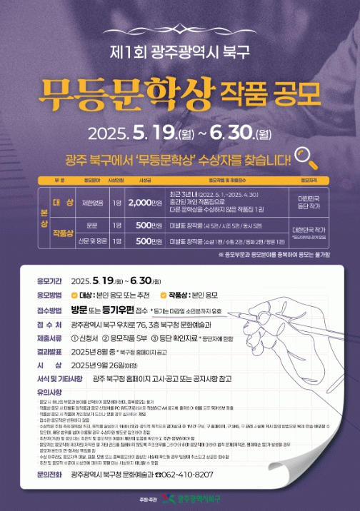 접수가 마무리되면 7~8월 중 전문가로 구성된 심사위원의 심사를 거쳐 대상 1명과 작품상 2명(운문 1명, 산문 및 평론 1명)을 선정할 예정이며 최종 결과는 8월 중 북구청 누리집을 통해 발표할 예정이다.