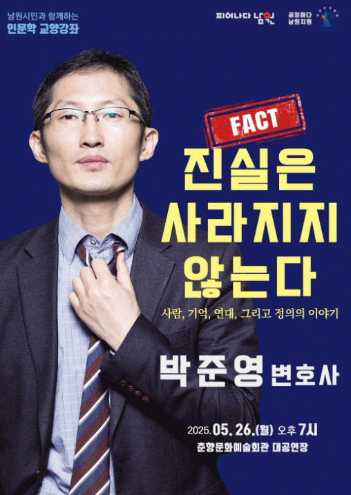 이번 강좌는 남원시와 남원지원(법원)이 협력하여 마련한 특별한 인권교육 프로그램으로, ‘사람, 기억, 연대, 그리고 정의의 이야기’를 주제로 시민들과 함께 정의로운 사회를 어떻게 만들어갈지에 대해 생각해보는 기회를 제공할 예정이다.