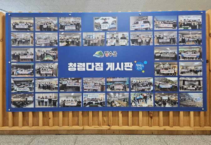 군은 지난 5월 1일부터 청사 본관 2층에 청렴다짐게시판을 설치하고 전 직원이 자발적으로 △청렴실천 서약문 △부서별 청렴 릴레이 사진 △청렴다짐 문구를 부착하도록 유도하고 있다.
